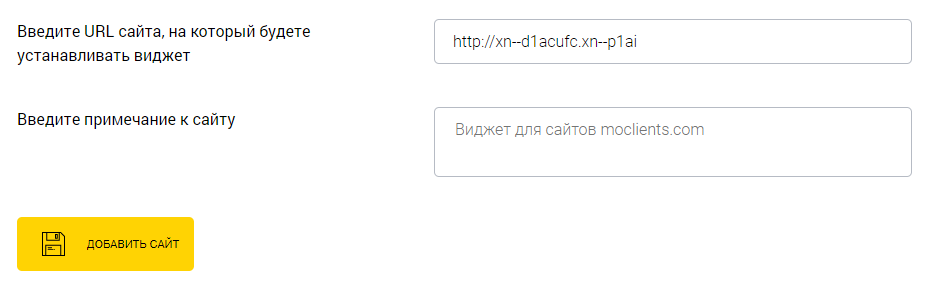 Находясь на вашем сайте просто скопируйте адрес сайта и вставьте в поле url. Затем добавьте его. Примечание: после добавления в списке сайтов будет отображаться кириллическими символами.