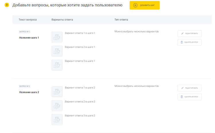 Условия показа вопросов настраиваются только для виджета типа “Квиз-тест”. Заходим в настройки виджета и мотаем на пункт 3 со списком вопросов квиза: