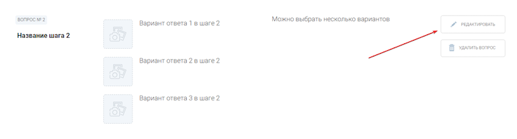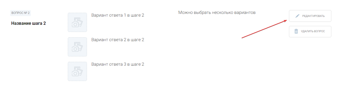 Первый вопрос всегда увидят все пользователи, для него настройки показа отключены. Чтобы перейти к условиям показа, нажмите на кнопку “Редактировать” напротив того вопроса, который нужно скрыть или показать исходя из предыдущих ответов пользователя. Для примера возьмём вопрос 2: