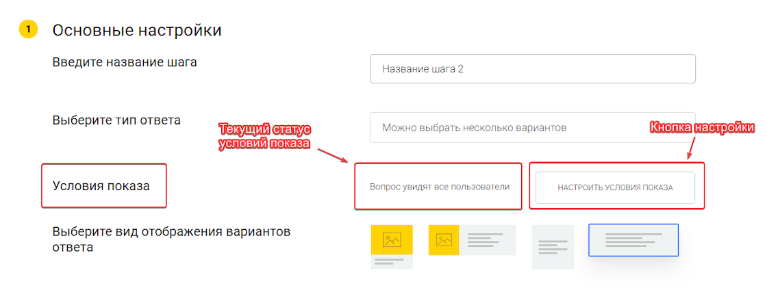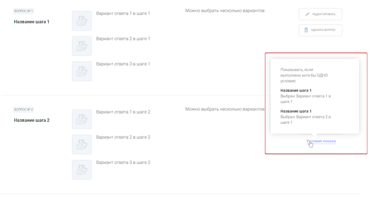Также можно быстро просмотреть текущие настройки условий показа для каждого шага в списке шагов, нажав на ссылочку “Условия показа”: