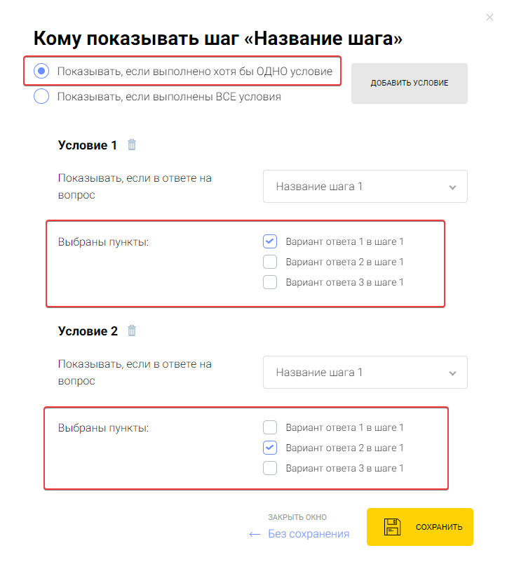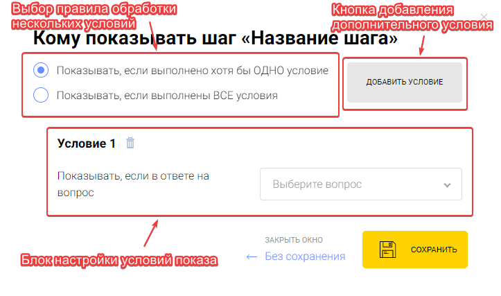 С помощью кнопки “Добавить условие” можно добавить дополнительные условия 2, 3 и так далее.
