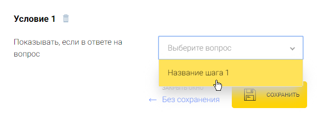 Далее переходим к блокам настройки условий. По-умолчанию уже создано одно условие. Нажмите на выпадающий список “Выберите вопрос” и вы увидите все вопросы, которые сейчас стоят ВЫШЕ текущего.