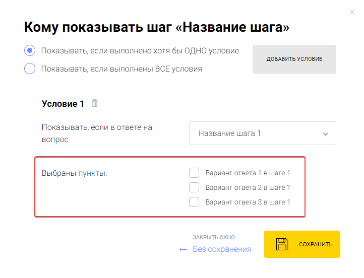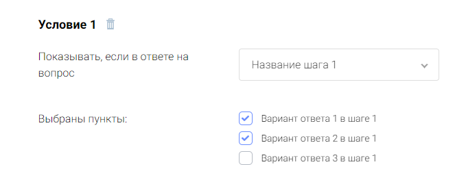 В зависимости от того, какой вопрос вы выбрали в блоке условий (вопрос с готовыми вариантами ответа, либо вопрос с текстовым полем для ввода ответа) появится разный интерфейс настройки. В этом блоке мы рассмотрим вариант исходного вопроса с готовыми вариантами ответа.