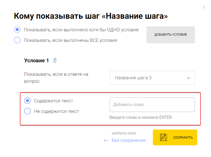 Теперь давайте рассмотрим вариант исходного вопроса, в котором пользователю нужно вводить текст в свободной форме. Вот так выглядит окно настройки условий: