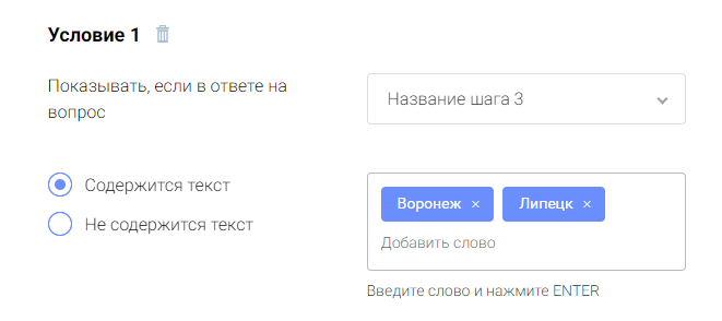 Обратите внимание, если вы добавили несколько отдельных слов, то алгоритм будет искать ЛЮБОЕ из них. Например, в примере выше вопрос будет показываться и после ввода “Воронеж”, и после ввода “Липецк”, и даже после ввода “Воронеж Липецк Москва”, но при этом не будет показан, если введено просто “Москва”.