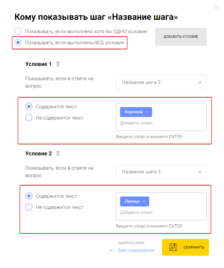 Если же Вам необходимо, чтобы в ответе содержались и “Воронеж” и “Липецк” одновременно, необходимо разнести их на разные условия и выбрать пункт “Показывать, если выполнены ВСЕ условия”:
