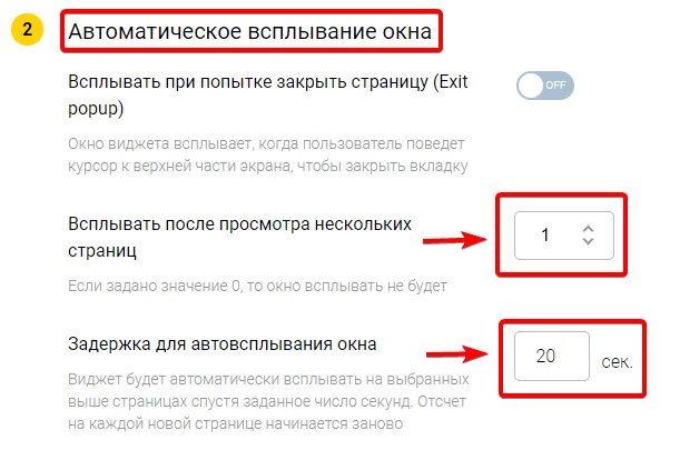 В пункте "Задержка для автовсплывания окна" укажите время задержки в секундах. Например, если Вам нужно, чтобы виджет всплывал через 20 секунд, введите число "20". Если в этом пункте будет указано число "0", виджет будет всплывать без задержки.