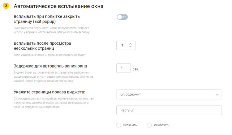Вам нужен раздел "Автоматическое всплывание окна". В пункте "Всплывать после просмотра нескольких страниц" укажите порядковый номер страницы, на котором будет всплывать виджет. Если Вам нужно, чтобы виджет всплывал на первой странице сайта, которую увидит посетитель, поставьте цифру "1". Если Вы хотите, чтобы виджет всплывал с третьей просмотренной страницы, укажите цифру "3". Если в этом пункте стоит значение "0", виджет не будет всплывать автоматически!