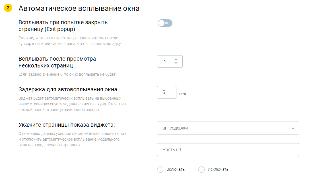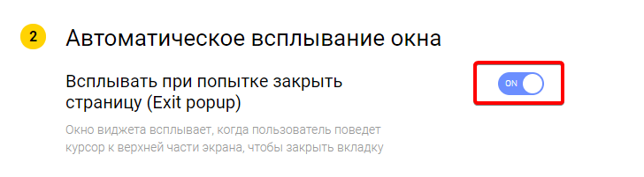 Для включения автоматического всплытия виджета при попытке пользователя закрыть страницу (Exit Popup) достаточно только включить соответствующий тумблер. Exit Popup по умолчанию всплывает на любой странице. Чтобы настроить конкретные страницы всплытия, воспользуйтесь настройками страниц показа виджета.