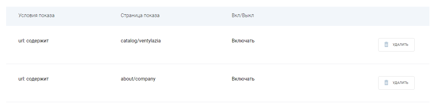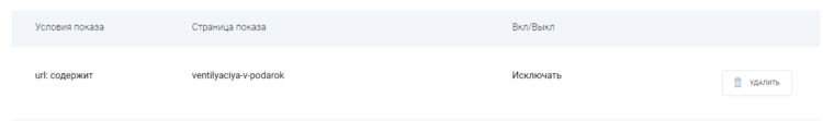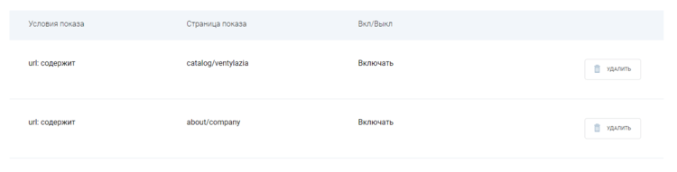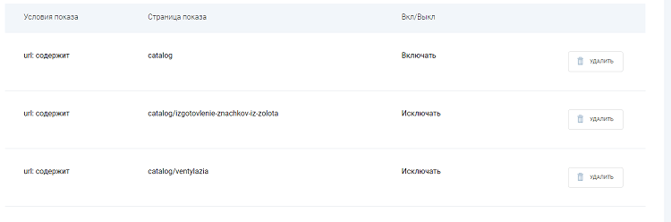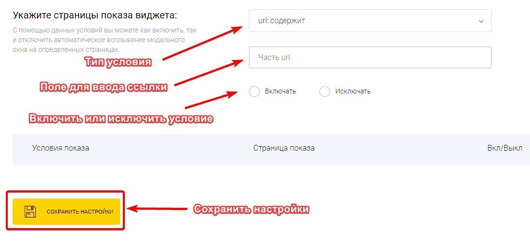 Для настройки страниц показа виджета выберите тип условия, введите нужную часть ссылки, укажите, включать или исключать эту ссылку, и нажмите кнопку "Сохранить настройки".